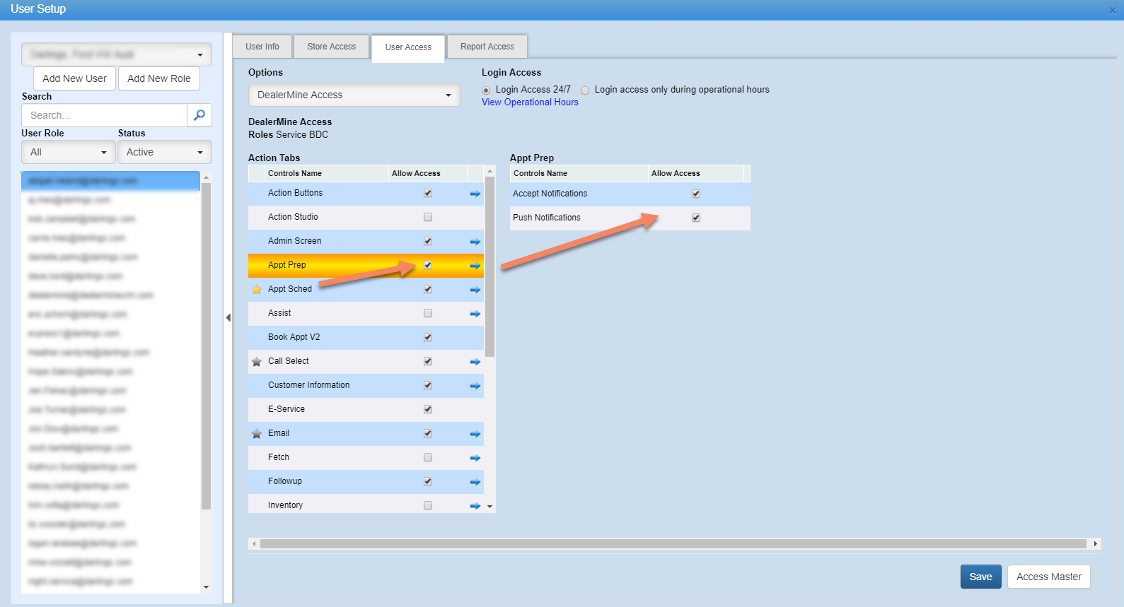 To give a user access to Appointment Prep, go to "User Setup" > Select User > click "User Access" > Check "Appt Prep"