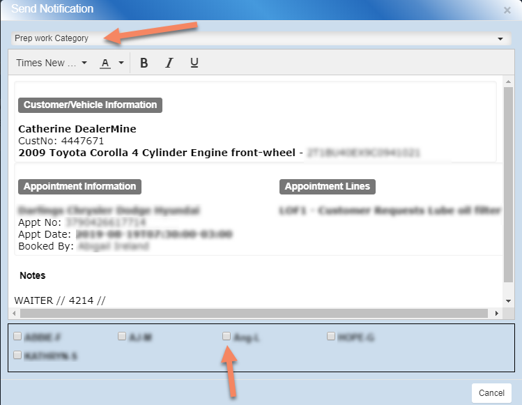 After you click "Book Appt" this window will appear. First, select which category the task falls into, and select the user you would like to notify. You can send to more than one users at a time. Then click "Send" in the bottom right hand corner.
