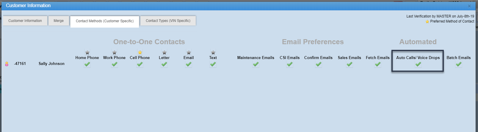 8. In “Customer Information” > “Contact Methods” Auto calls has been changed to display as “Auto calls/Voice drops. This will make it more clear to the user how to turn off a customer for voice drops if they insist.