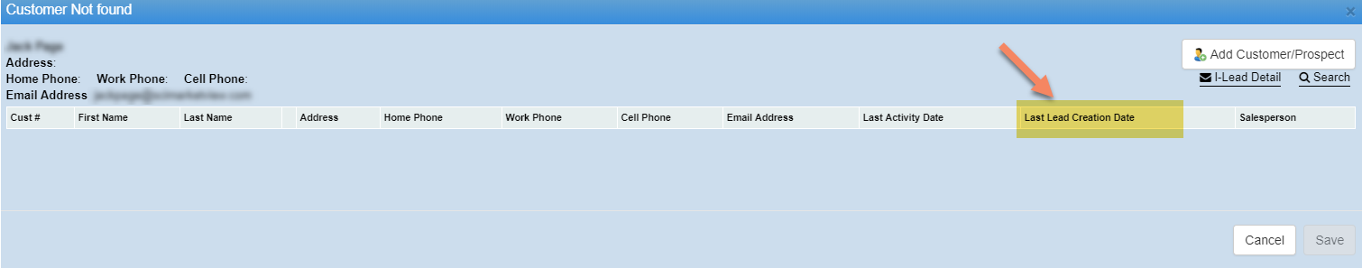 3. When searching to link a Web lead to a customer profile the popup screen will now display “Last Lead Creation Date “. This column will serve as a quick reference to the last date a lead was created for the possible match.
