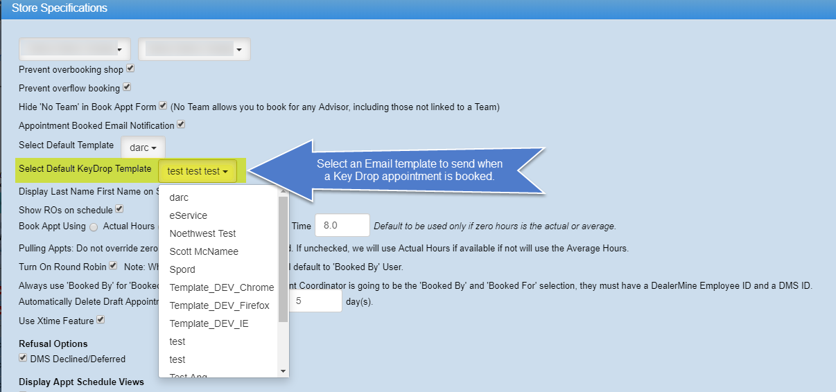 In Store Specifications we've added an option to chose a default email template upon booking a key drop appointment.