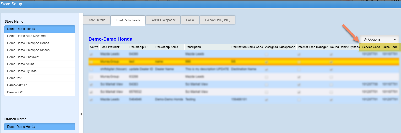 7. Users are now able to add both a Service and Sales code for a third party lead. Click on "Options" to add a new provider, or edit an existing.