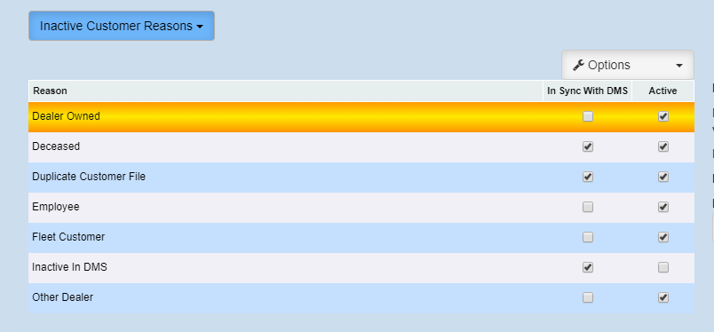 QUORUM - In Turn off Management > Turn Off Codes > "Inactive Customer Reasons", we have added a column, "In Sync with DMS”. When the box is checked, that reason code will be pushed to the DMS, if not checked then the change will not be pushed, and only be marked inactive in DealerMine. By default all boxes will be checked.