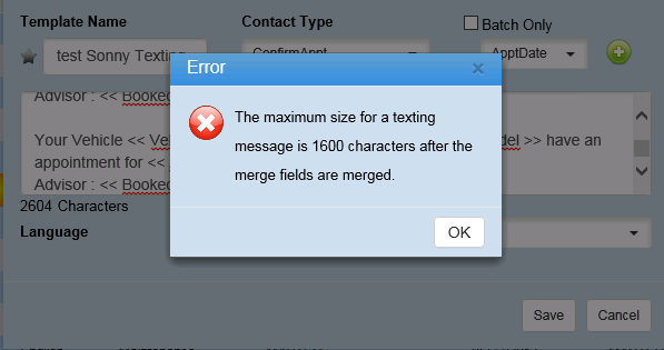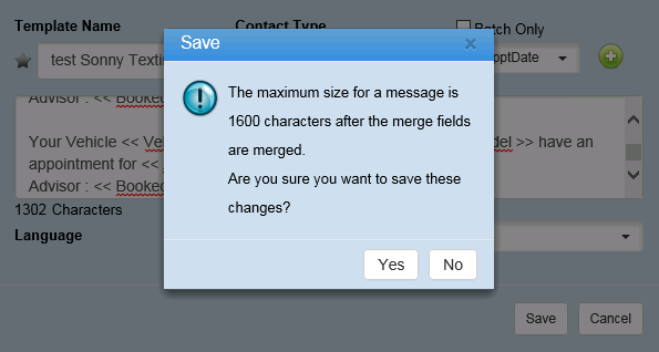 9. Twilio allows a maximum amount of 1600 characters for each text sent. A warning message will display if a user has at least 1000 characters in the template to warn them that after all of the merge fields are filled in, it could potentially go over 1600 characters and will not be sent. We take into account that 600 characters could be filled in after merged just to be safe.