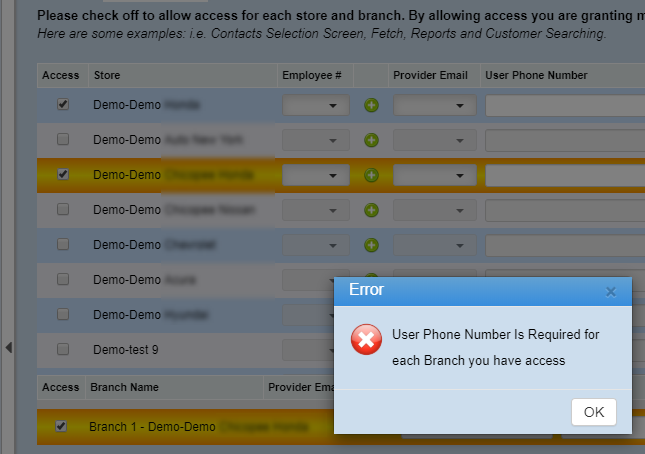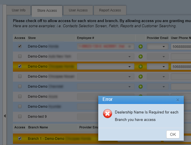 When giving a user access to another store/branch, there are two fields that require information in order for it to save. The two fields are "User Phone Number" & "Dealership Name". These two fields are required as they carry over to the users email signature. DealerMine will display the following errors after clicking save if a user forgot to fill in these fields.