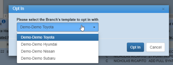 2. If a store has multiple branches, DealerMine will display this window to users after clicking the grey SMS bubble to opt a customer in for texting. Now, they can manually select which branch to opt the customer in to.