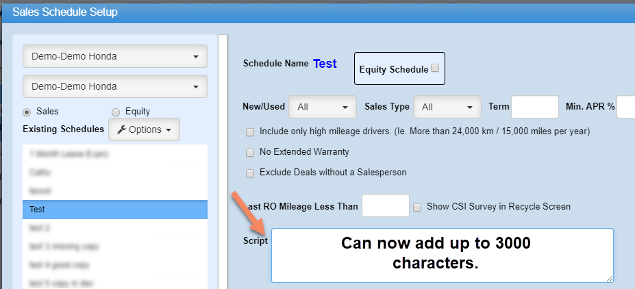 3. We have increased the amount of characters in the Scripting text box in the Sales schedules setup screen from 1500 characters to 3000 characters.