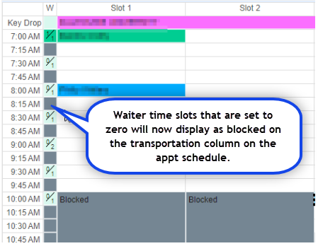 1. The Appointment Schedule will now display waiter times slots that are set to zero, as a Block time in the Transportation column making it more clear for the user while booking.