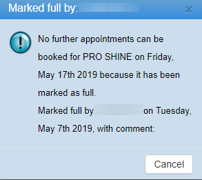 Shop/Team - When the Shop/Team is marked as full and preventions are turned ON the user will not be able to over book and will get a popup message letting them know why they cannot book. When the Shop/Team is marked as full and preventions are turned OFF user will have to use the Override Booking Limitations to book.
