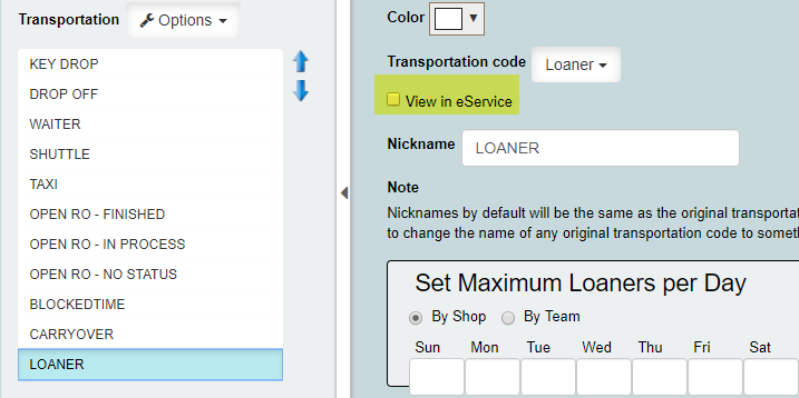 4. eService - Dealerships that have eService now have the option to setup "Loaner" for a transportation when booking through eService. This can be setup in Transportation configuration.
