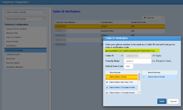 18. DealerMine will now display the account SID under Caller ID Verification in Telephony Configuration setup screen.