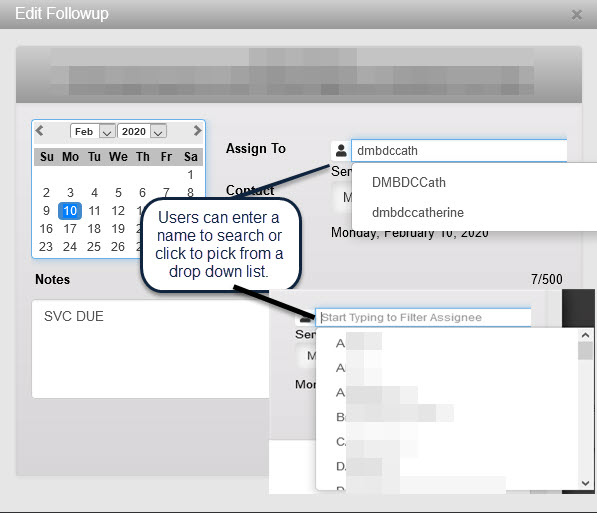 12. When creating or editing a follow up, the “Assign To” option has been updated with the option to search for a user. The drop down with a list of users will still appear, but users can also type a name to search as well instead of scrolling through the list.