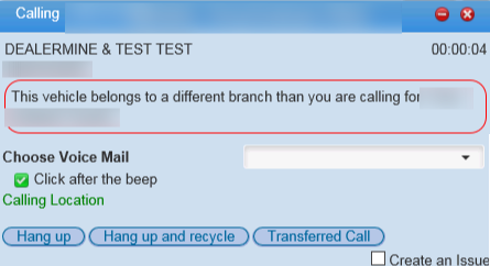 10. When users are using Telephony to make Outbound calls there are times when a user doesn't have access to the voice files of the branch they are calling for, or the vehicle that they are calling on belongs to a different branch. In these cases they will get the following errors in the Call Pop when trying to make a call.