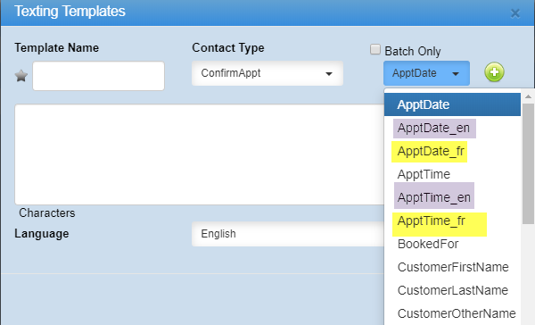 11.We have added two new merge fields << ApptDate_fr >>, << ApptTime_fr >>, << ApptDate_en >> and << ApptTime_en >>. These merge fields have been added for users who wish to create bilingual templates, this would include both French and English scripting in one template.