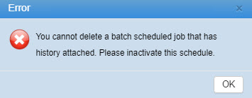 Did you know, when trying to delete a Batch Schedule that has history attached to it the user will receive an error letting them know this and that they will have to inactivate the schedule.