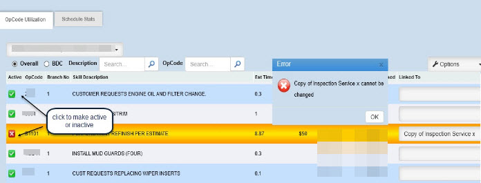 5. When in Opcode Utilization, we have removed the Save button as Save will occur when an Opcode is linked to a Maintenance group or the Status has been changed to active or inactive. The Active/Inactive button will display at the beginning of the line and will display as a green check for On and a red X for Off.