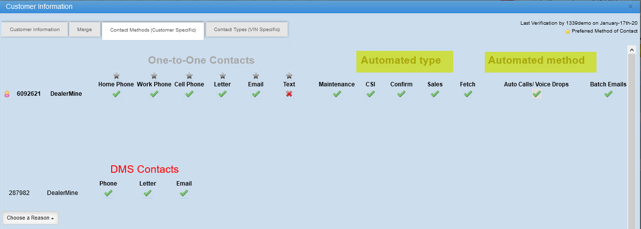 14. In the Customer information screen under the Contact Method tab DealerMine has changed the section "Email Preferences" and "Automated" to "Automated Type" and "Automated Method". When checked or unchecked these settings will affect automation for Voice Drops, Email, and Text.