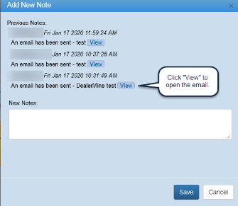 "An email has been sent - DealerMine test View" . Click on the View and the email selected will open. From the email screen users can view the email and Reply.