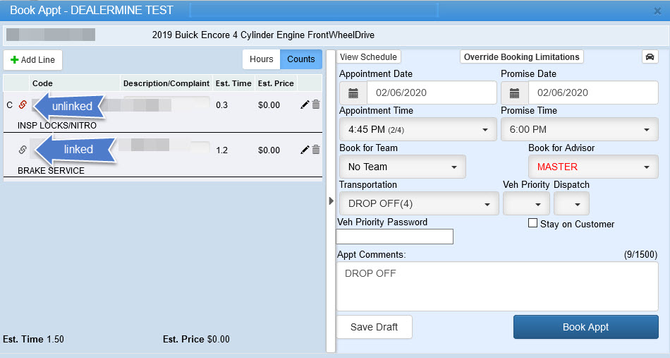 4. When booking an appointment in DealerMine the "Link" icon will display whether the opcode is linked to a Maintenance group or not, so it was hard to distinguish between a linked and unlinked opcode.