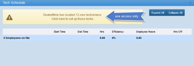 7. When working from the Appt Sched and a user has selected to “View Tech Schedule” from the drop down, the message “DealerMine has located __ new technicians. Click here to setup these techs.” will only display for users that have access to the Technician Setup.