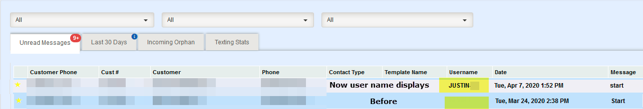 4. When a text comes in and a match is found, the "user name" of the last person that last communicated through text with this customer will display on the Texting tab > Unread Messages.