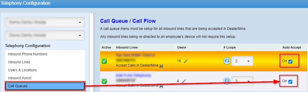 First if you want the calls to be automatically pushed to the DealerMine telephony user you can turn that on by going to Admin > Telephony Configuration > Call Queues ( Please ensure you select the correct store and branch from the drop down) and make sure ‘Auto Accept’ radio button is checked.