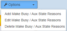 To add a new Aux State go to options in the top right of the setup screen and select ‘Add Make Busy / Aux State Reasons’. (users can also edit and delete aux states by selecting the correct aux state and using this drop down).