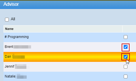 To select specific advisors click the pencil icon, unselect all and then use the provided selection boxes to include the Advisors you wish. Select Save when finished.