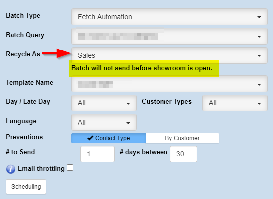 When creating a batch Fetch Automation and the recycle drop down is set to "Sales" now new text will display letting the user know the batch will not send before showroom is open.