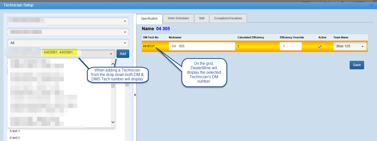 We have changed the Technician setup screen to display both the Tech DM and Tech DMS number. When adding a Tech from the drop down both DM and DMS number will display in the list, also when a Tech has been selected from the active list on the left side of the setup screen and on the Specification tab the DM Tech number will display on the grid.