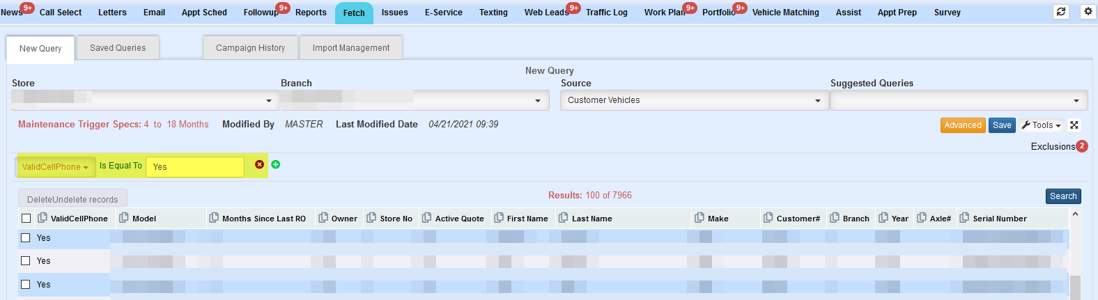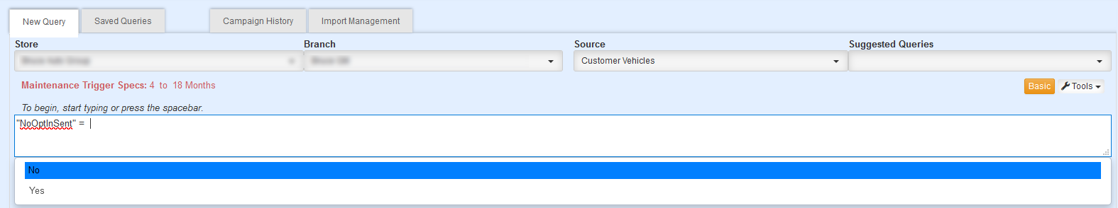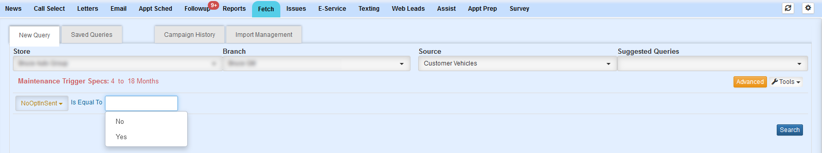 3. A new fetch field “NoOptinSent” has been added to the Source Customer Vehicles. This new field can be ran two different ways: