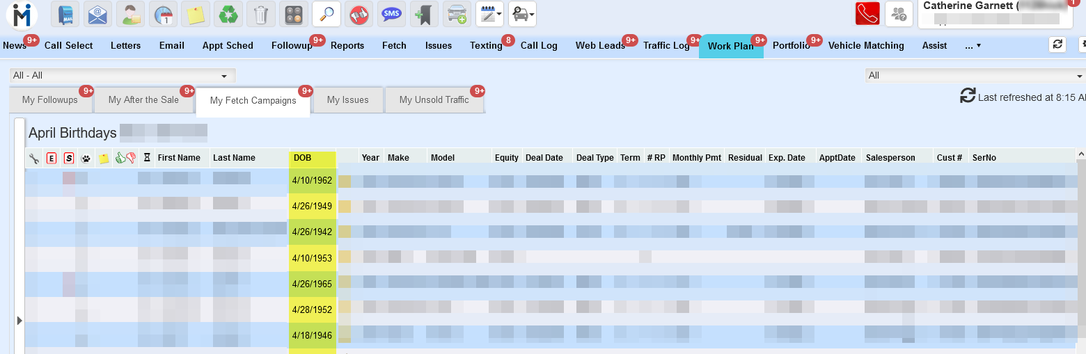 3. In the Work Plan > My Fetch Campaigns tab, a new column has been added "DOB" (date of birth), the column is sortable, which will give users a fast and easy way to contact customers on their Birthday.
