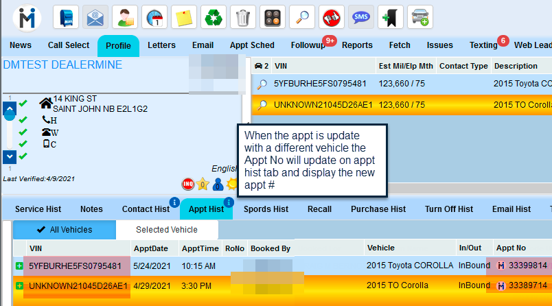 2. Reynolds - When updating an appointment by changing an unknown vin to the vin on the customer file, once the Update Appt is clicked DealerMine will delete that appointment and create a new appointment and an Appt ID.