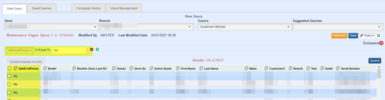 “ValidCellPhone = No, will return all the customers with an invalid cell number.
