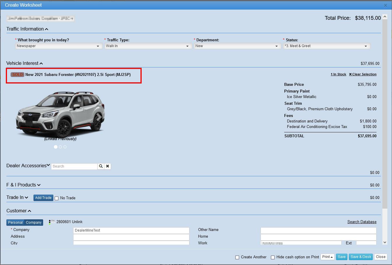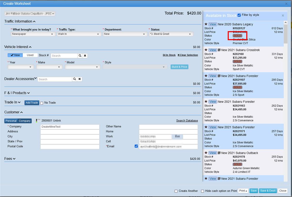We have added a SOLD indicator to vehicles displayed in the worksheet. This will display when the user opens the Available in Stock slide window, and will also display under the Vehicle Interest field, if a user searches by Stock # or by Year, Make, Model and Style as well.