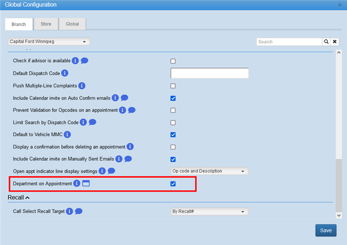 For Reynolds, we have added the ability to push the Department on appointments. Previously when the appointment pushed to the DMS it would default to “S”. Now it will remain set as what the user selects when booking the appointment. This feature must be turned on in Global Configuration as shown below and this option will display for ERA stores only.