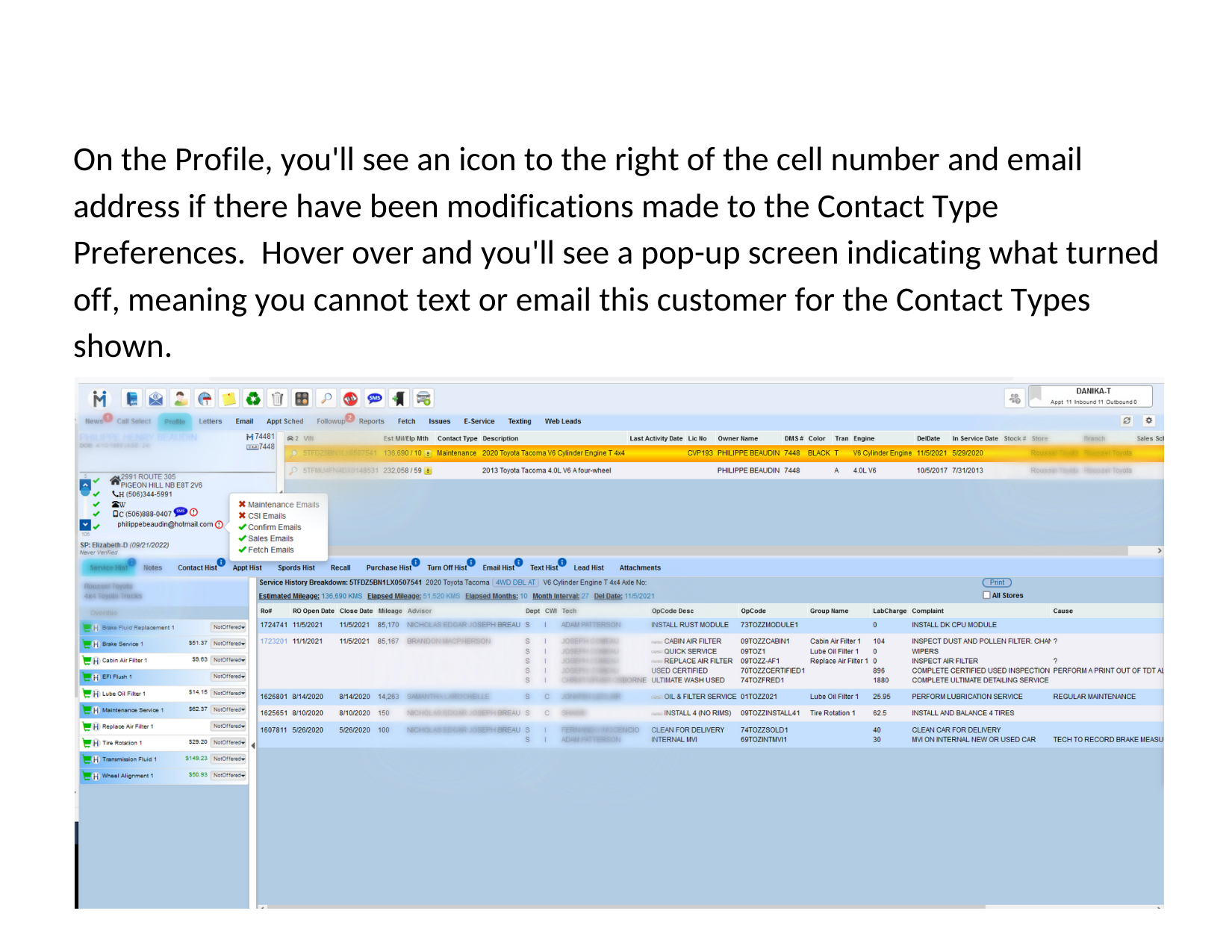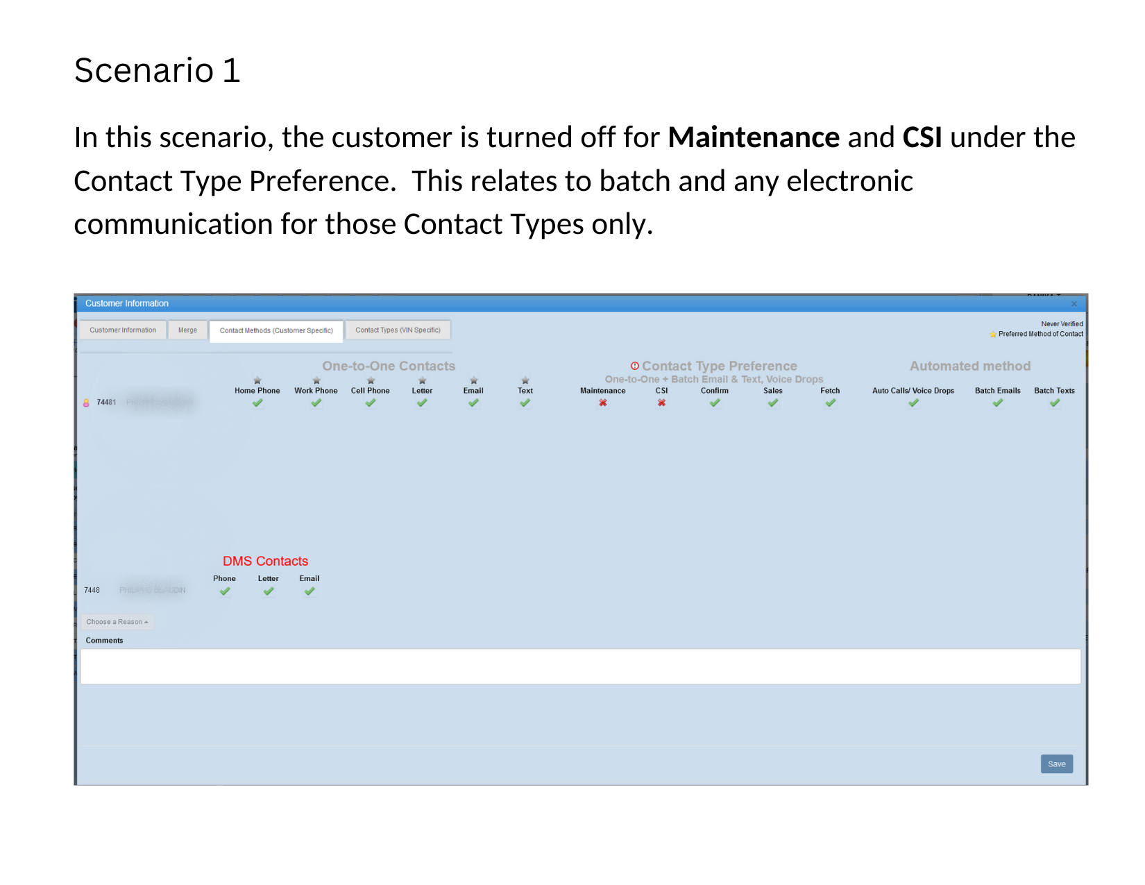 4. Contact Type Preference - we have changed the middle section of verbiage in Contact Methods (Customer Specific) to be Contact Type Preference. (One-to-one + Batch Email & Text, Voice Drops) This section handles all electronic communications, not impacting the Call Select for phone calls being presented. The ! icon will be present on the Customer Profile if the user is turned off for one or more of the contact types of electronic communications. This will prevent the customer from receiving emails, texts, voice drops for the specific contact types only.