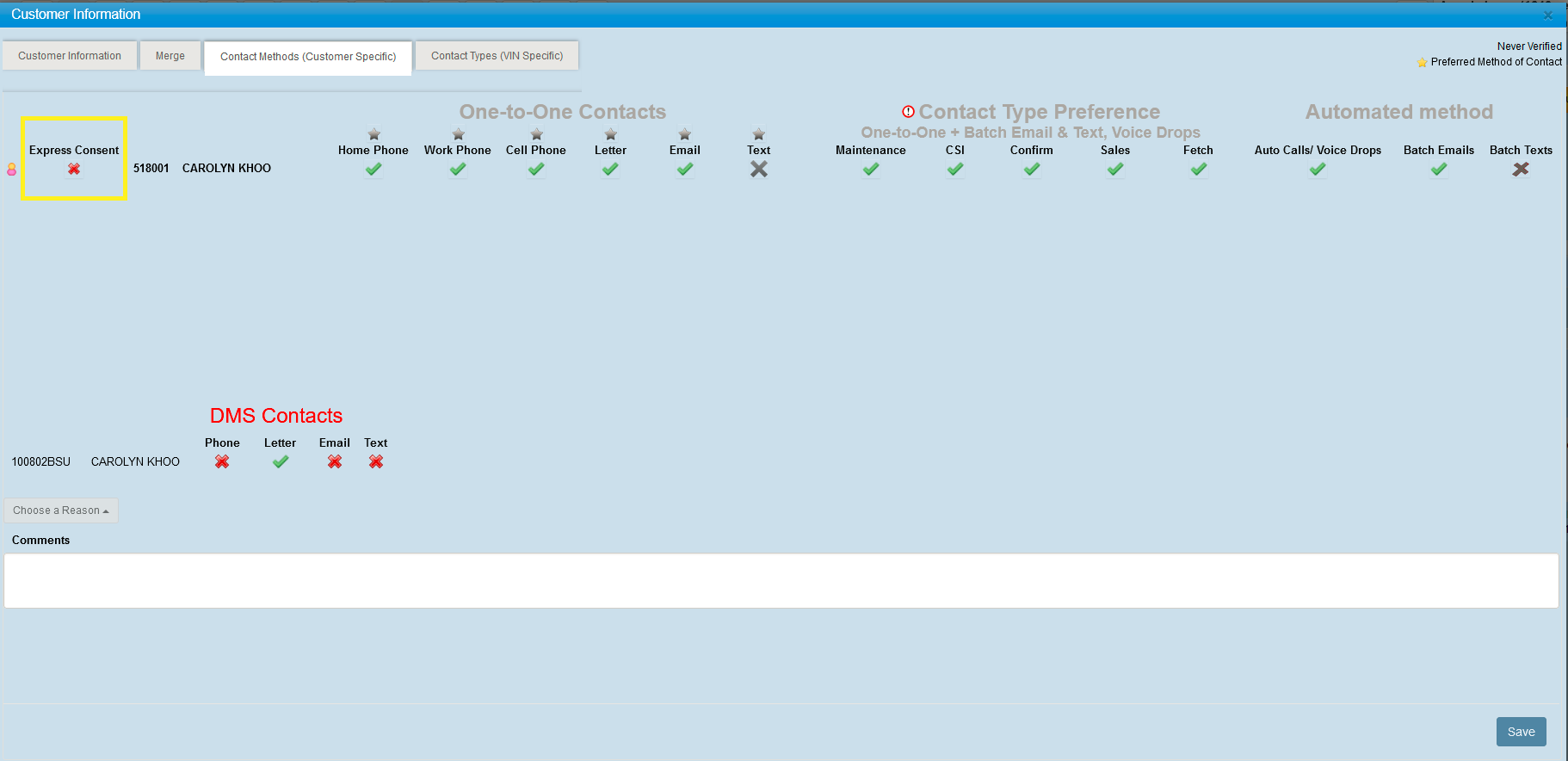 We have relocated the Express Consent flag, which can be turned on by any user in DealerMine. It is now located under the Customer Information screen > Contact Methods tab. Express consent is the clearest and strongest kind of consent a business can have when dealing with CASL, and if you can get it you should. This will allow the dealership to contact this customer electronically if it's been over 18 months since the last business transaction.