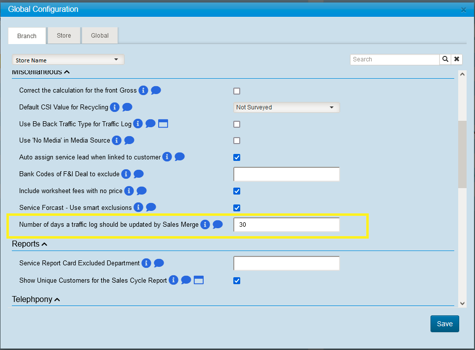 We have added a new configurable option to Global Configuration that will control the Sales Merge logic. This sets the number of days to determine if a sales merge should update an existing traffic log or create a new one. The default value is 30. Ie. If a customer purchases a vehicle and the last time that customer was logged on the Traffic Log was 45 days ago, then Sales Merge will add a new piece of traffic.