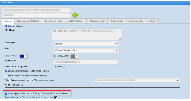 Previously we had a flag in the background for Quorum DMS dealerships using Online Scheduling that would allow free form appointments to be pushed to the DMS directly. We have now moved this flag to the front end in E-Service configuration. When this option is on, the Push Directly to DMS and Do Not Push Directly to DMS options are hidden.