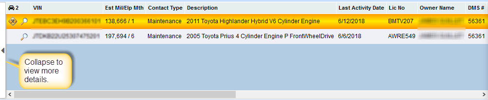 We display all vehicles that exist on the customer file in an easy to view grid. Vehicle information displays all vehicles on the customer profile you are viewing. Newly added vehicles (with or without a VIN) on integrated stores will appear automatically.