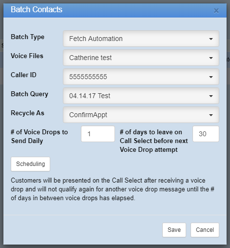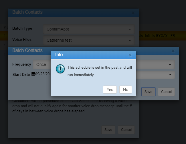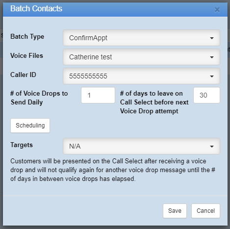 Note: You cannot schedule a voice drop job to go out the same day of setup if the contact type is Maintenance. Maintenance voice drop jobs require the nightly download.