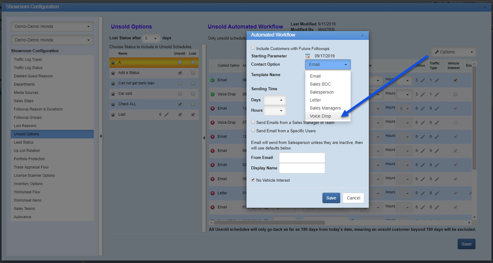 Please note: We currently do not have a fall back option unless a Voice Drop is sent to a customer on the call select screen, in any of the following contact types: Maintenance, No Show, Confirm Appt, or CSI.