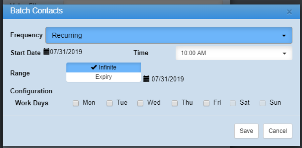 If you chose Recurring, you can pick a range. If the Voice Drops going out are seasonal, or for a limited time special, then you would choose an expire date. Click the calendar icon to see the calendar.