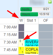 To view available waiter slots on the Appointment Schedule select the star beside waiter. This will open the 'W' column which displays waiter appointments booked/available waiter appointments per time slot. Â
