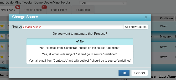 The popup will also have the option "Do you want to automate that Process?", Radio buttons will display where the use can select No or Yes. Yes options will also include using either the from Email Domain or the Email Subject or both. Having multiple options will save you time and move any other leads with the same format to the newly chosen "Source".