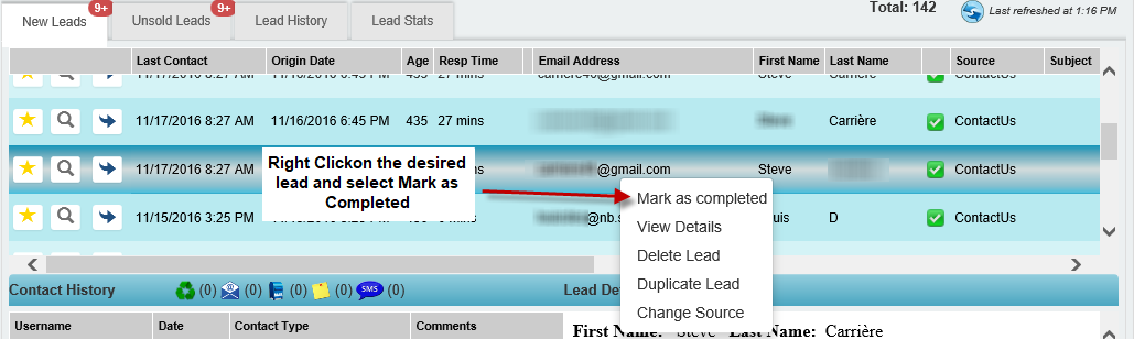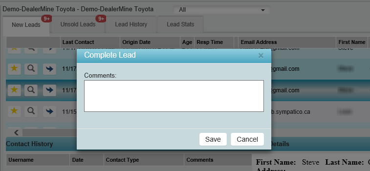 Mark Lead as Complete- Mark a Sales Lead as complete and all users with access will be able to see that the lead has been taken care of; from the Complete Lead popup the user can add notes to the Comment box and Save. Once saved the Comments entered will be stored in Contact History.