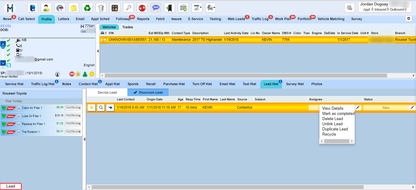 Click the Lead indicator on the Profile tab. The Lead popup is presented containing the Lead's Details. From this screen either mark the task as Sold, Followup, Lost or Recycle the customer off the screen to be viewed at a later date. When the user does any of these actions, from within the Leads' tab grid, the customer is no longer bolded and is no longer on the New Leads tab.