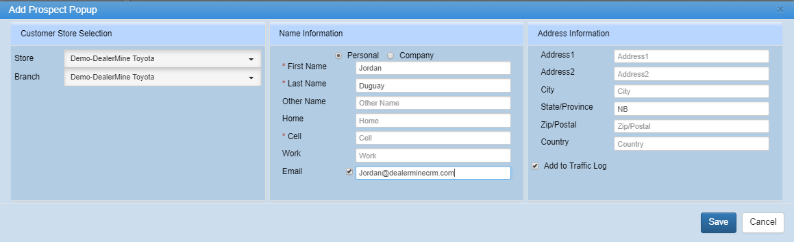 Fill in as much information as possible and select Save. **Note if you would like the lead to also appear on the Traffic log in sure the Add to Traffic log radio button is selected.