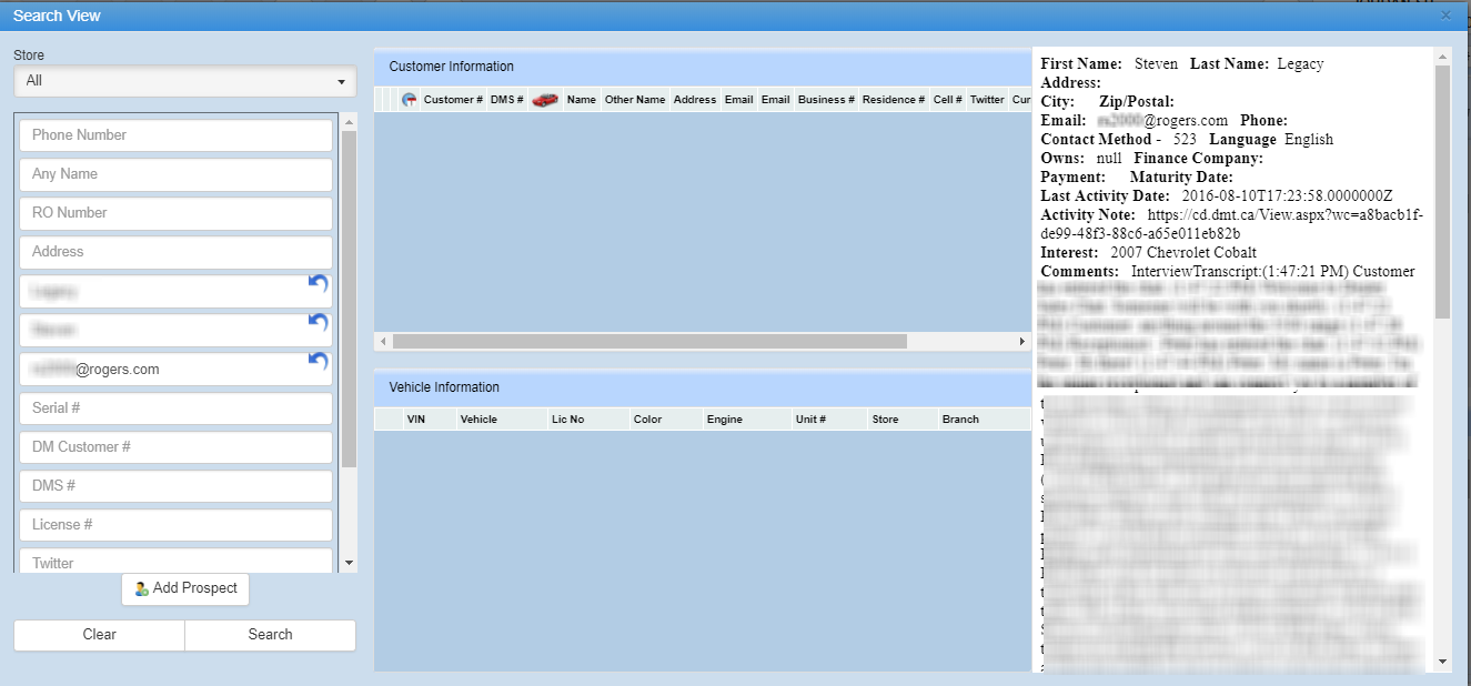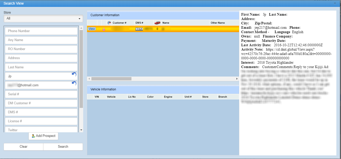 In this image DealerMine was unable to find a existing customer match, so the user would need to select the Add Prospect button to create a prospect file for this inquiry